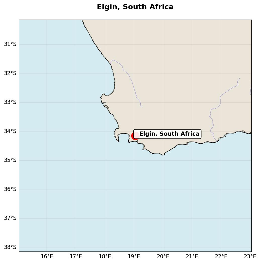 Elgin, located southeast of Cape Town in South Africa's Western Cape, is celebrated for its cool climate and elevated terroir nestled between 250 and 500 meters above sea level in the Hottentots-Holland and Kogelberg mountains.